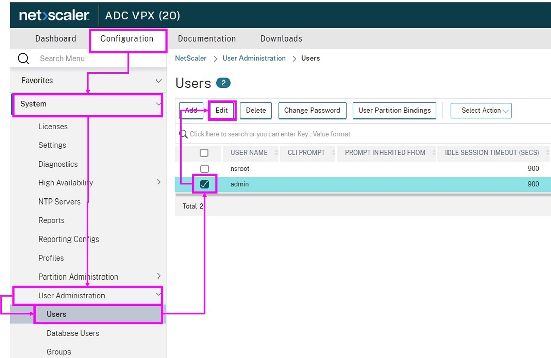 GUI の Configuration タブ画面にて、「System > User Administration > Users」をクリックして Users 画面を開きます。プロンプト設定対象のユーザにチェックを入れ、「Edit」をクリックします。