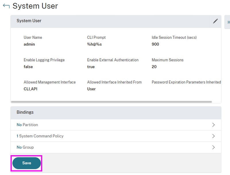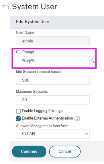 MyVPX@admin@22:55> set system user admin -promptString "%h@%u@%T"
