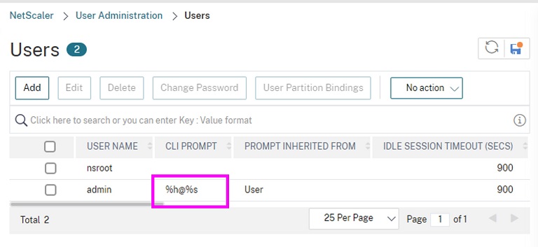 Users 画面にて対象ユーザの CLI PROMPT 欄に設定したプロンプトが表示されていることを確認します。